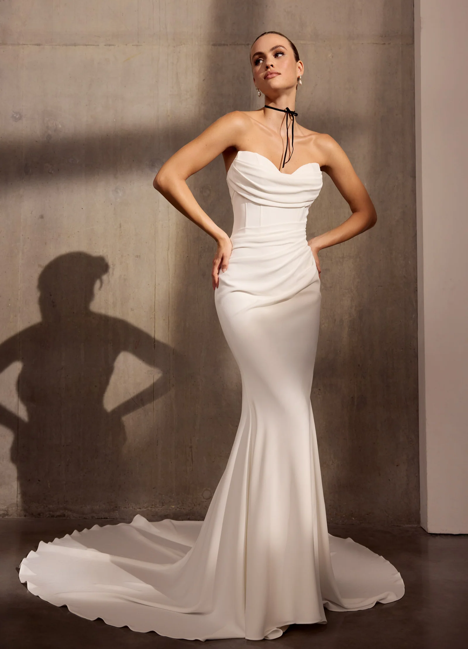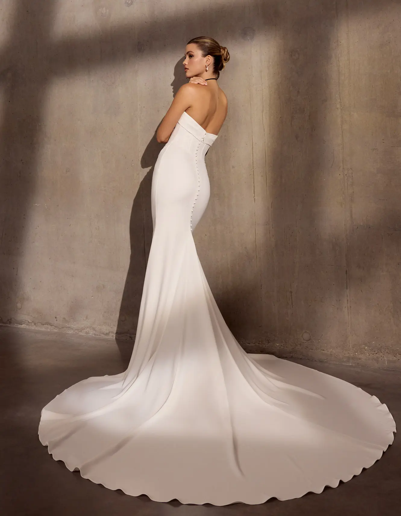 Discover CLEO, AvenueByJosephine’s latest bridal masterpiece. Crafted from luxurious georgette crepe, this strapless wedding gown features figure-enhancing draping and a beautifully corseted basque waist. Finished with elegant covered buttons and optional sleeves for versatile styling, CLEO embodies timeless sophistication and exceptional craftsmanship.