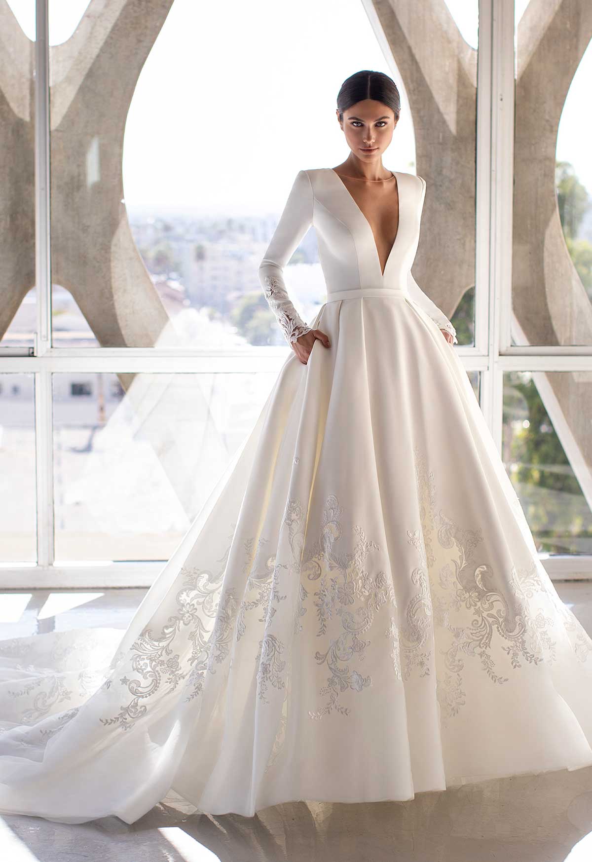 Light and enveloping. Delicate lace and beaded details melt into a fluid silhouette that naturally follows the body. Designed for a romantic and elegant bride.