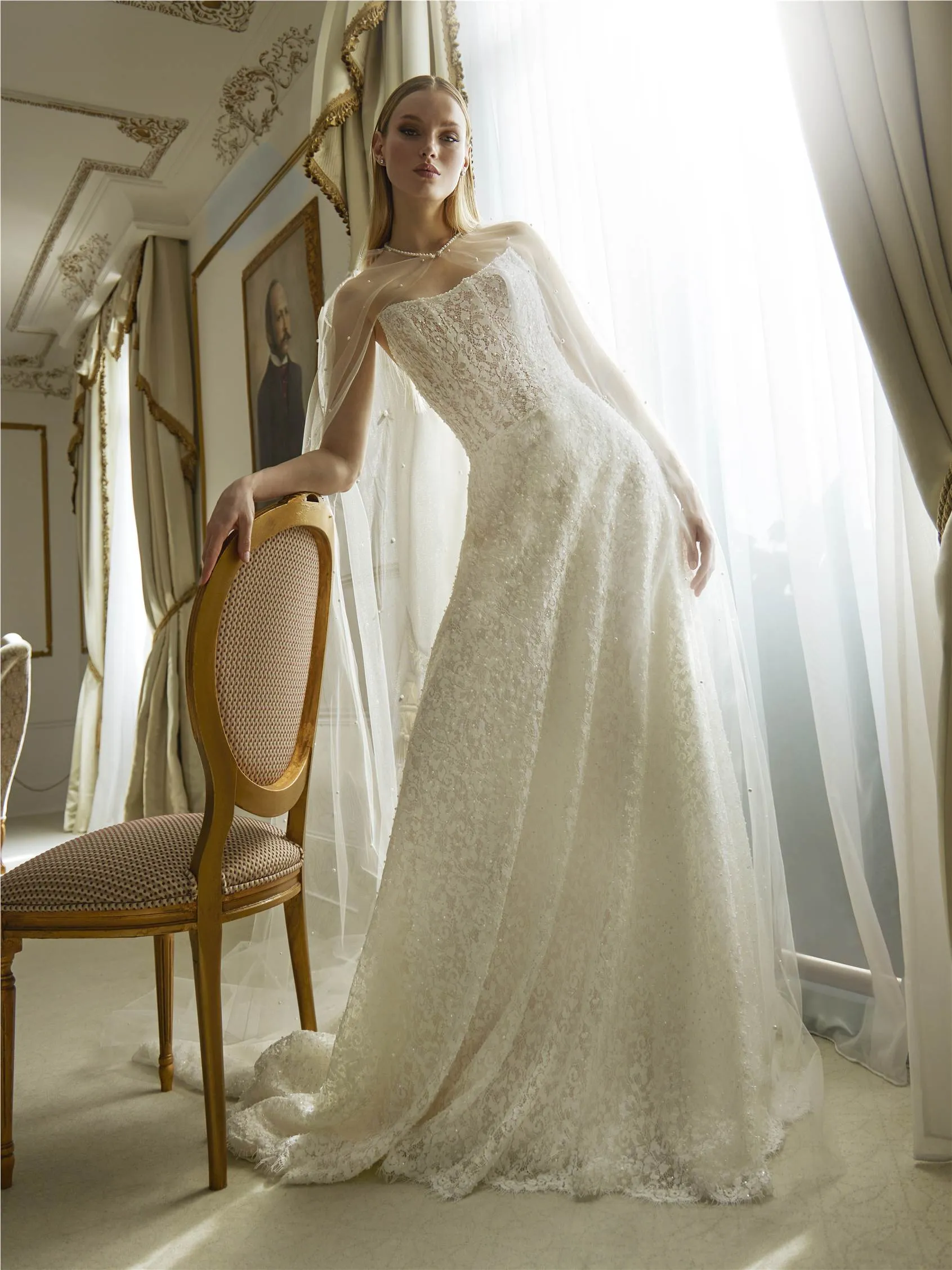 Light and enveloping. Delicate lace and beaded details melt into a fluid silhouette that naturally follows the body. Designed for a romantic and elegant bride.