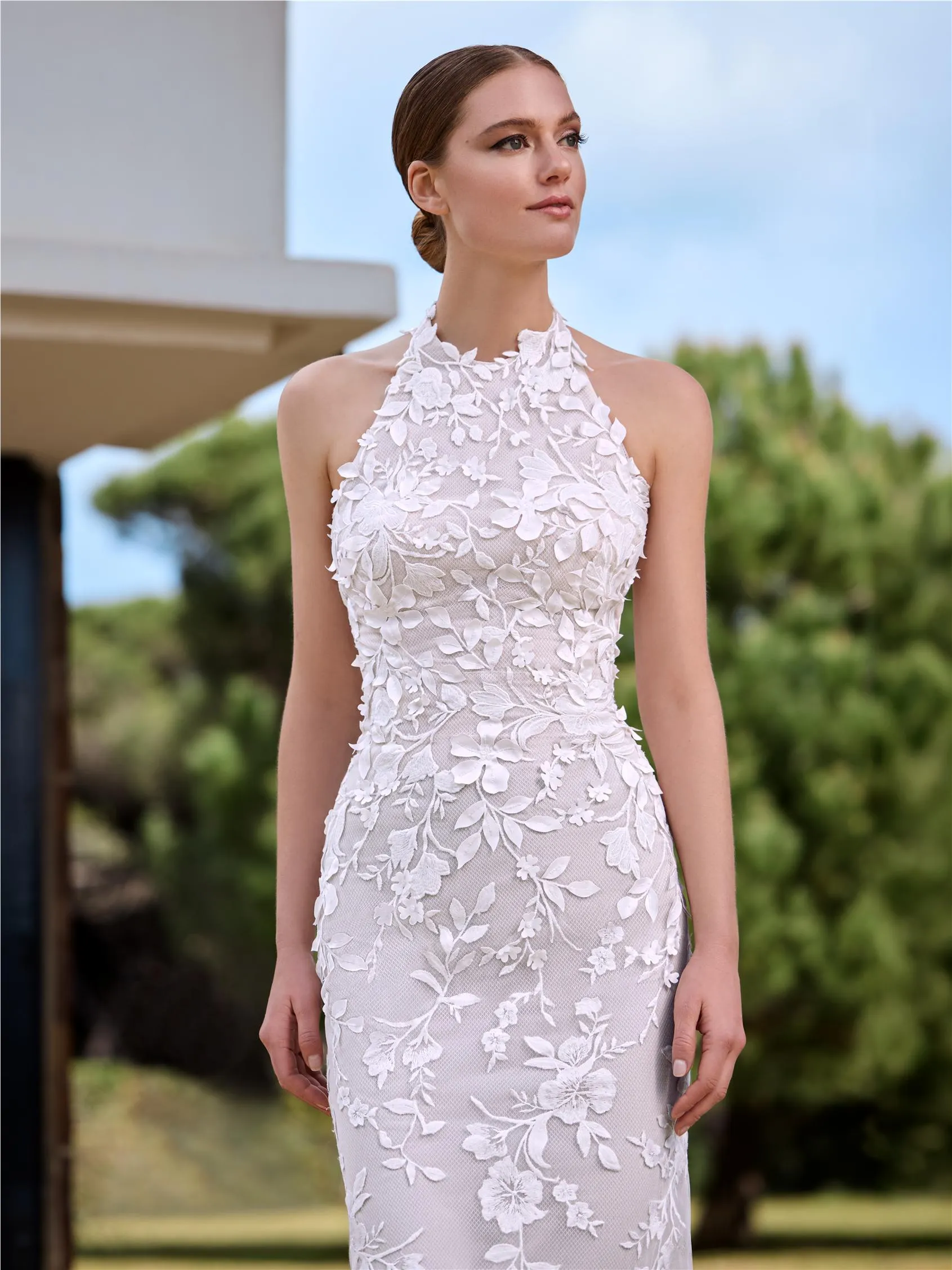 Designed to stand out, this mermaid-cut dress combines a halter neckline with an open back that adds freshness and allure. Floral lace appliqués on tulle create a rich, enveloping texture, perfect for an elegant and contemporary celebration.