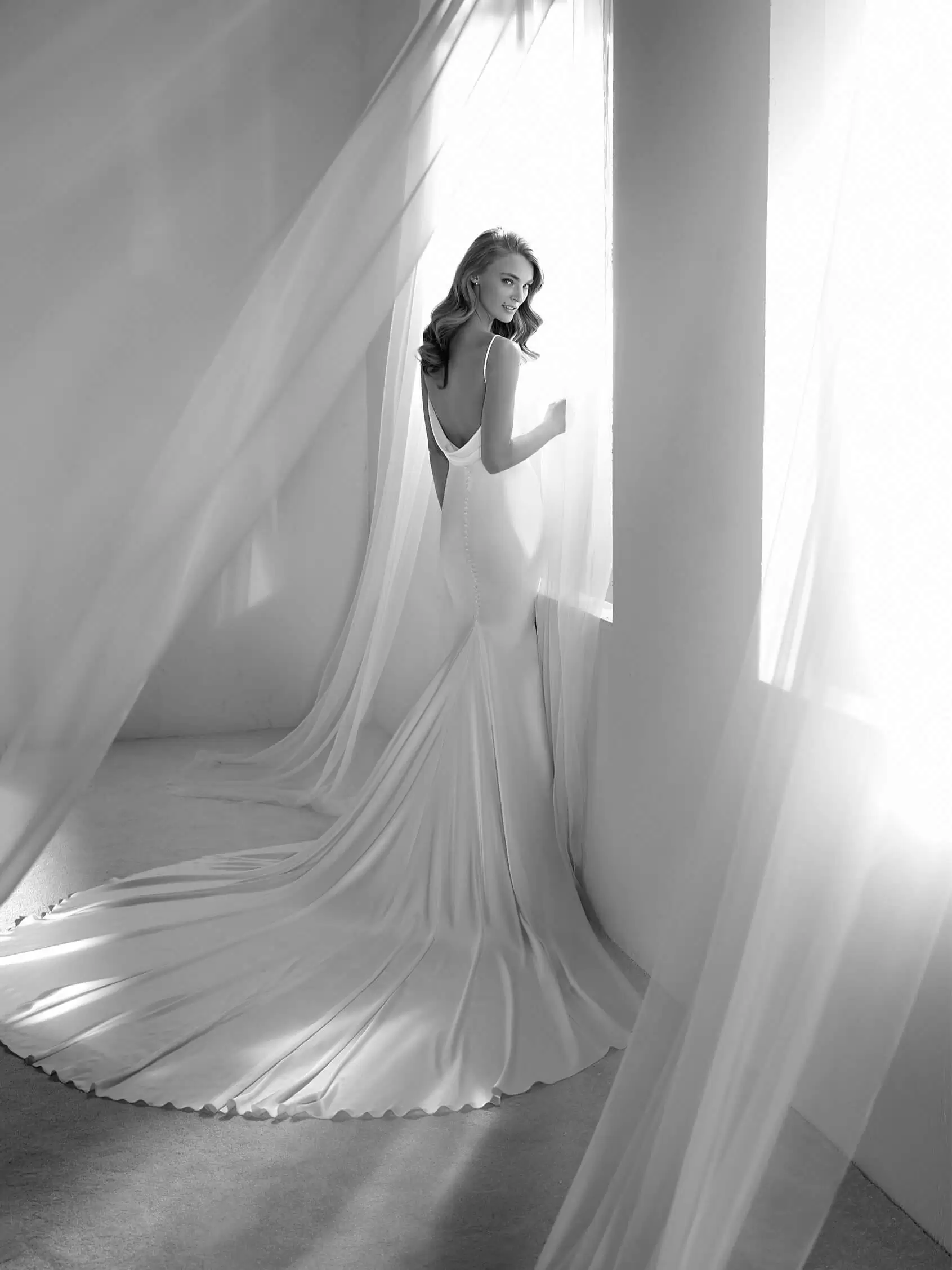 This sleek satin wedding dress gracefully skims over the body, flowing into a long, elegant train. The semi cowl neckline adds a touch of softness, while fine straps extend down the low back to meet a charming cowl detail, finished with a row of satin buttons for an extra touch of sophistication. A sleek, simple, yet undeniably glamorous wedding dress.