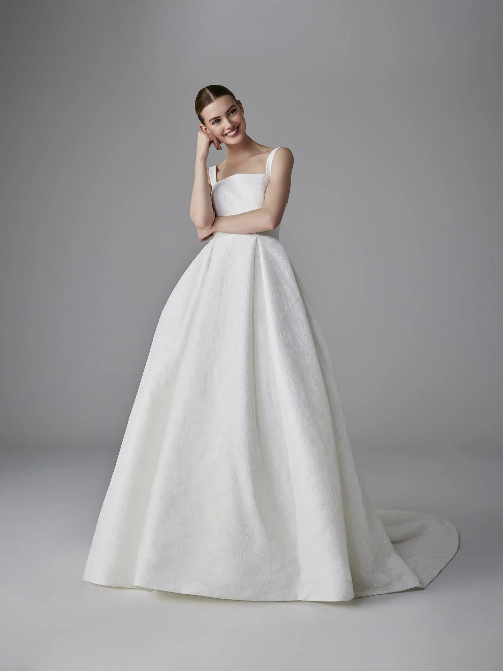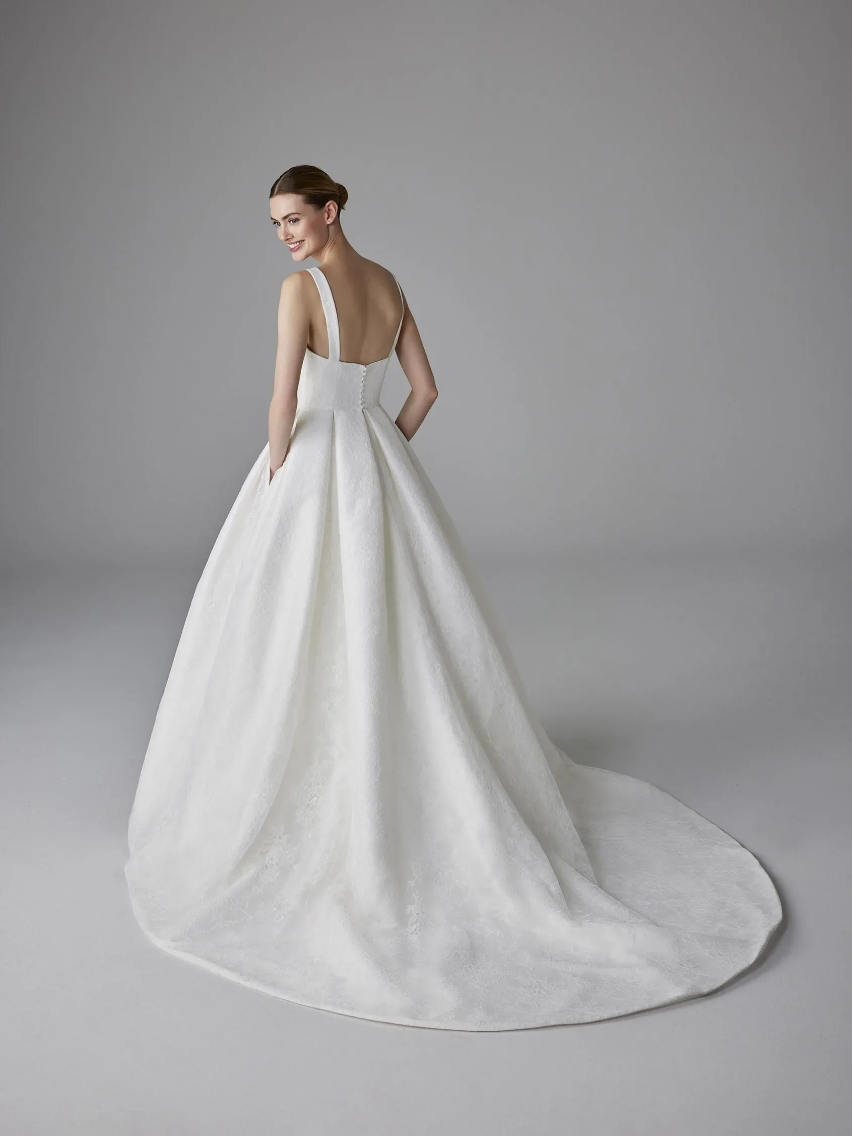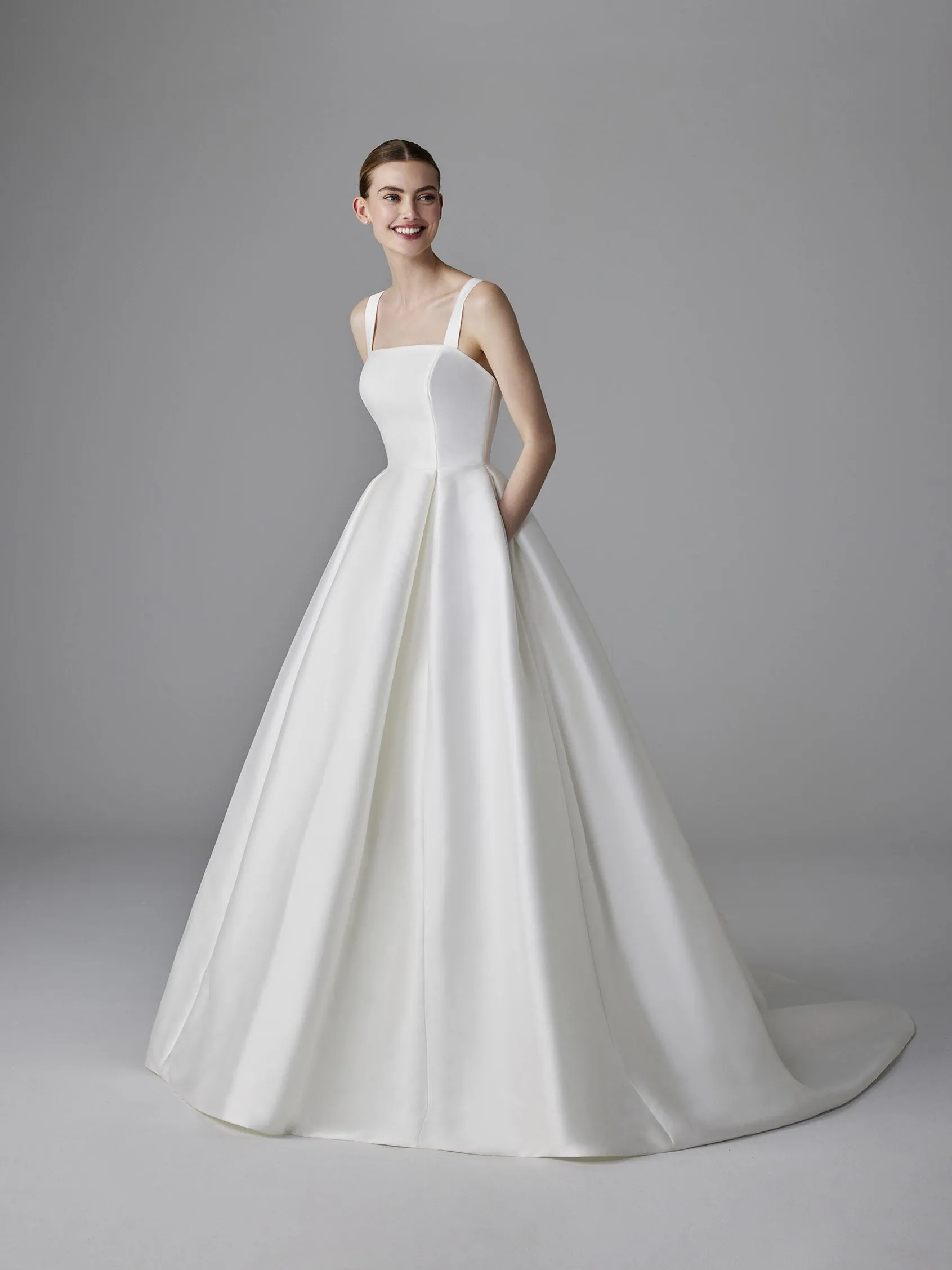With ROSAMUND, you step into the role of a modern fairytale heroine. Crafted in structured mikado, this gown features a corset-inspired bodice with a clean square neckline at both the front and back, complemented by wide straps for elegant support. The voluminous princess skirt flows effortlessly, complete with discreet, practical pockets and a breathtaking 200 cm train that adds dramatic, storybook grandeur.